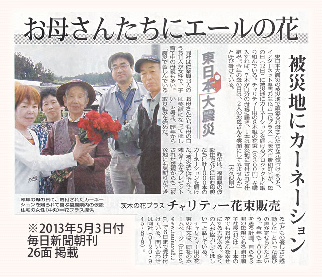 このプロジェクトは、なでしこマミーカーネーション花束に入っているカーネーションの本数は、8本ですが、「その中の1本を被災地の小学校送り、子供達からお母さんへお花をプレゼントする」というもので、8本分の価格(通常価格)で購入いただき、足りない1本のお花を福島へ寄付するという、2人のお母さんが笑顔になれる新プロジェクトです。花束をもらうお母さん、さらに被災地の子供さんからお母さんへと笑顔が繋がる、母の日お花プロジェクトです。