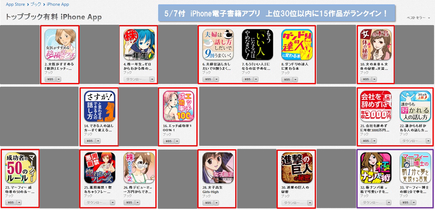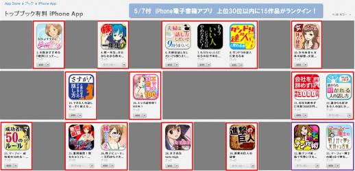 iPhone・iPad,Kindle向けに電子書籍配信を行う株式会社オープンアップス(東京都渋谷区 代表取締役 加藤秀樹)は5月7日付でiPhone電子書籍アプリランキングでトップ30位以内に15作品がランクインしたことを発表しました。