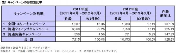 ・2011年度は4月~7月までの間、東日本大震災の影響を受け、キャンペーン数が激減したこと(表2参照)。