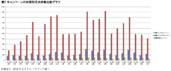 2012年度を対象とした調査結果(表1参照)ではキャンペーンの総件数は10,153件であり、2011年度の総件数7,915件から約128%に増加しました。