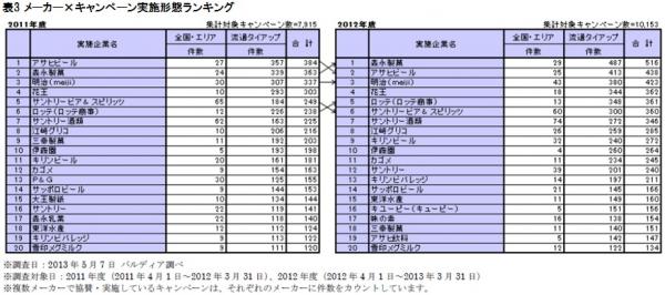 今回の調査で1位となったのは森永製菓株式会社で、キャンペーン実施件数は516件(表3参照)。2位はアサヒビール株式会社で438件、2011年度の首位を明け渡しています。3位は株式会社 明治(meiji)で423件の結果となりました。