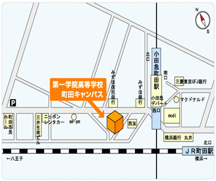 小田急町田駅西口改札から右手の階段を下りて、右に向かって下さい。みずほ銀行の前の交差点を渡るとローソンが見えます。そのビルの5階が町田キャンパスです。