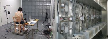 48台のプラグファンをインバータで個別に回転制御し、自然通風の風速変動・風速分布を作り出すことができる特殊な装置です。風の温度や湿度も制御できます。気候室の外形は、幅5m、長さ11m、高さ3m。風速範囲は0~3m/s、温度範囲は20~35、湿度範囲は50~80%。自然通風を対象とした「世界にも類をみない研究施設」です。