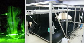 竜巻状の旋回流を再現することのできる装置の開発を行いました。静止状態の再現装置,移動効果を再現できる装置が開発されています。また,これらの装置では,可視化,風速計測はもとより,風圧力を計測することのできる設備も備えています。