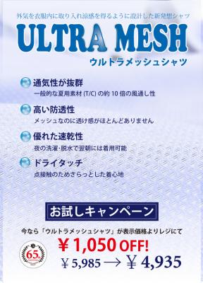 ※ 通気度は235cc/cm2/sec。これは綿ポリエステル素材と比較すると約10倍の風通し性です。当社の「ウルトラメッシュシャツ」はポリエステル100%素材になります。