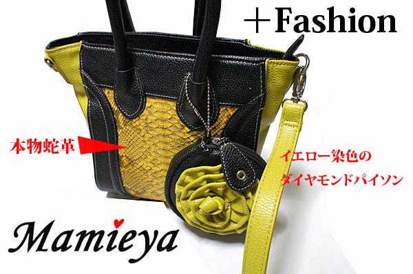 ■商品名:Mamieyaレディースバッグ黄色染色蛇革+Fashion 価格 15000円 【税込み】