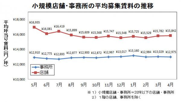 また、小規模店舗の平均募集賃料は、4月に前月比0.4%上昇しましたが、2012年の秋以降、1.5 万円台半ば程度で安定的に推移しています。