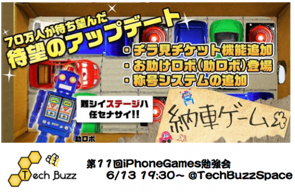 株式会社HatchUp( 所在地:東京都新宿区 代表取締役八反田智和 )は、2013年6月13日(木)19:30-22:00、「第11回iPhonegames勉強会 ~100万人がプレイした「納車ゲーム」ができるまで~ 」を開催いたします。無料イベントとなっておりますので、皆様お気軽にご参加ください。