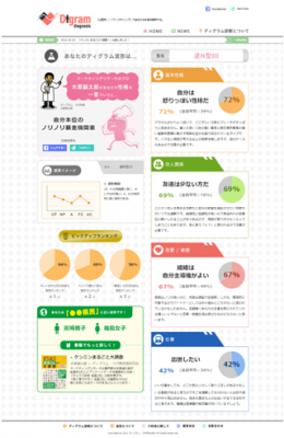 ディグラム・ラボでは、iPhoneアプリまたはFacebookログイン後、Webサイト上で20問の簡単な質問に答えるだけで診断結果を無料で受け取ることができるサイト「ディグラム診断」(http://digram-shindan.com/)を公開しています。