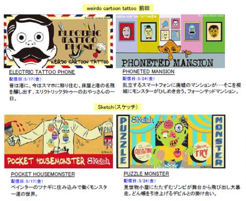 展開するきせかえの内容は、「POCKET HOUSEMONSTER」「ELECTRIC TATTOO PHONE」「PUZZLE MONSTER」「PHONETED MANSION」の全4種類です。価格は全て500ポイント(500円に相当)となります。常識の枠にとらわれない独創的なアートが魅力的で、アーティストの自由な作品表現によりLOWBROW ARTファンのみならず幅広い世代に楽しめるデザインとなっております。