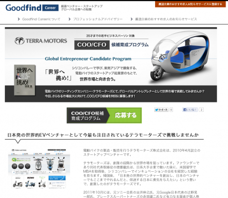 応募希望者は、まず上記サイトより応募登録し、テラモーターズについて熟知したGoodfind Careerのアドバイザーが面接/面談を実施し、テラモーターズの経営陣との面接に進む流れとなります。募集期間は、2013年6月10日(月)まで。