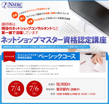 ネットショップマスター資格認定講座は、従来の関連資格との差別化を「超実践型」と位置付けたEC運営担当者向けの講座。 講義同日の座学試験を経て一般社団法人ビジネススキル協会より認定取得点に応じて認定を行う資格。