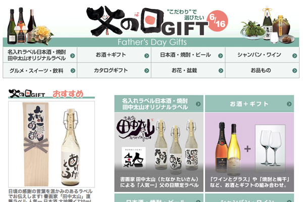 父の日特集は、「名入れラベル日本酒・焼酎」「お酒+ギフト」「日本酒・焼酎・ビール」「シャンパン・ワイン」「グルメ・スイーツ・飲料」「カタログギフト」「お花・盆栽」「お品もの」の8カテゴリで構成されています。