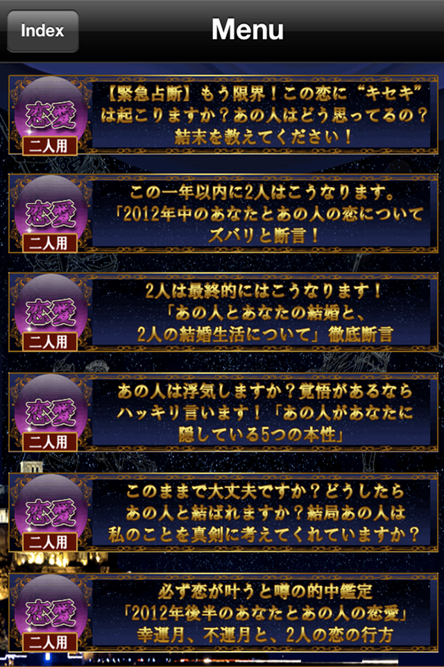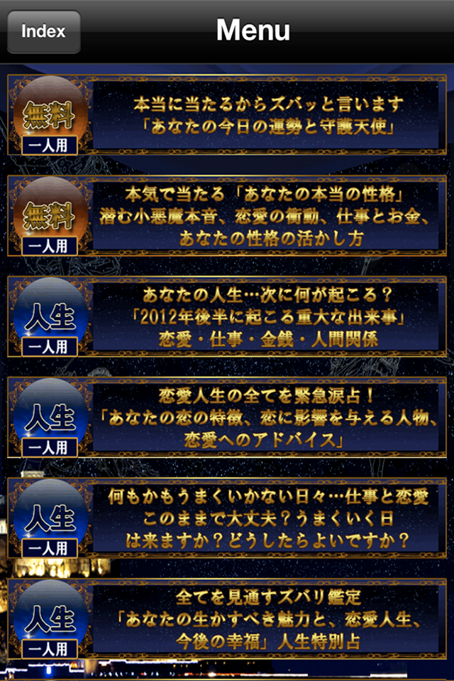 鑑定メニューは無料メニュー2メニューに加え、詳しく鑑定できる有料(350円、450円、500円、600円)の21メニューをご用意しました。