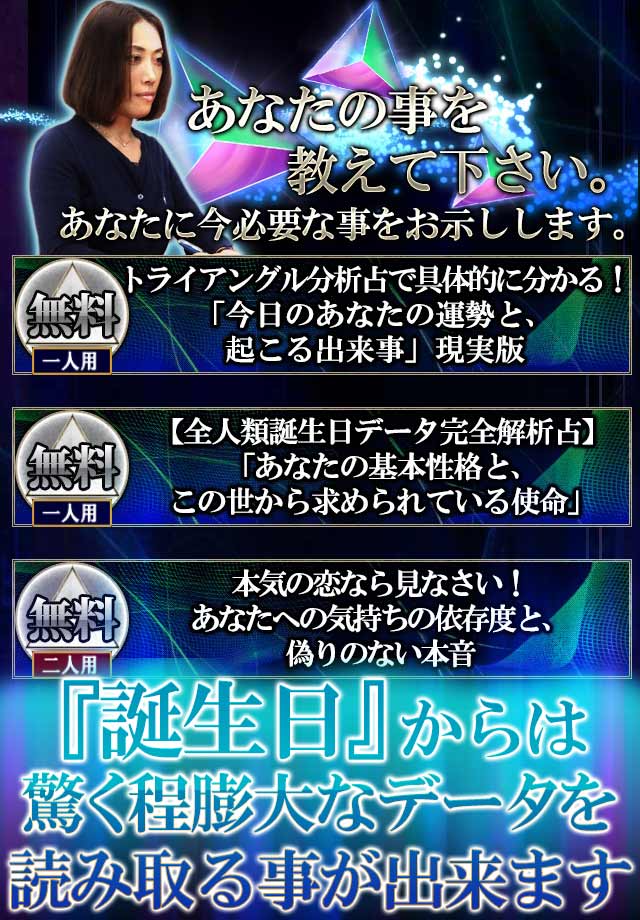 本コンテンツは渋谷で話題の鑑定士「佐藤七緒」が独自の理論「コンプリート・トライグラム」にて鑑定する占いアプリです。