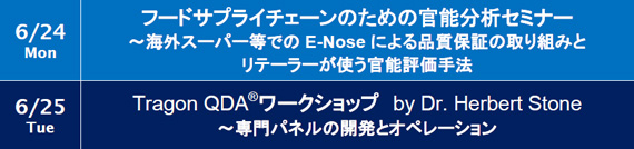 6月25日(火)は、Tragon QDA(R)の要点を網羅した1日ワークショップです。 専門パネルの開発とオペレーションを中心に、QDA法の基本および本質をDr. Herbert Stoneが解説します。 QDA法は、機器分析データとの相関を得るにも大変有効な官能評価手法です。一部誤解されて伝達されているQDA法の見直しや、 すでに社内で遭遇している困難を解決する絶好の機会ともなります。 (日本語通訳・英文テキスト・昼食付き)