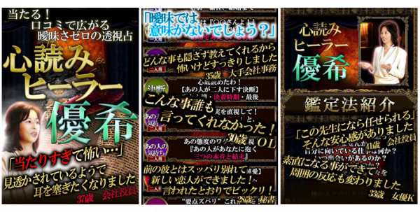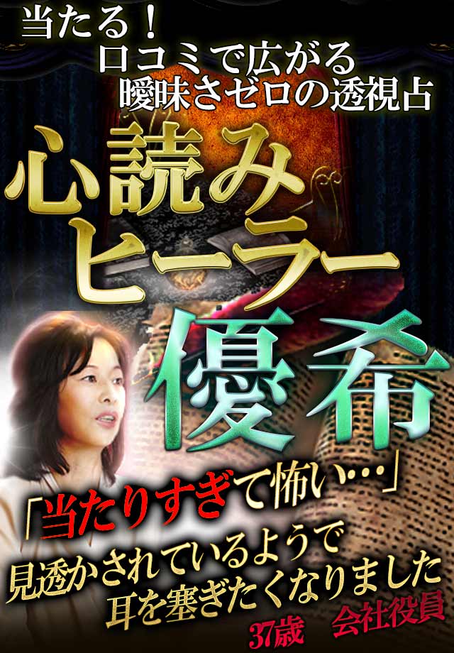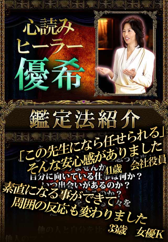 本コンテンツは、心読みヒーラー「優希」がこれまで多くの人を鑑定してきた中で、独自に導きだした透視法を用いた占いアプリです。