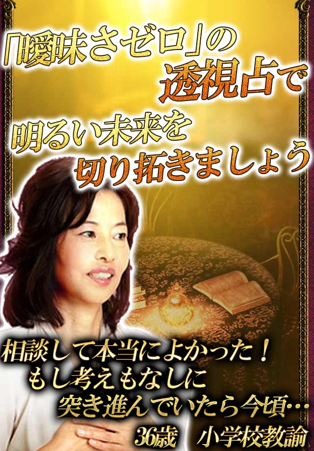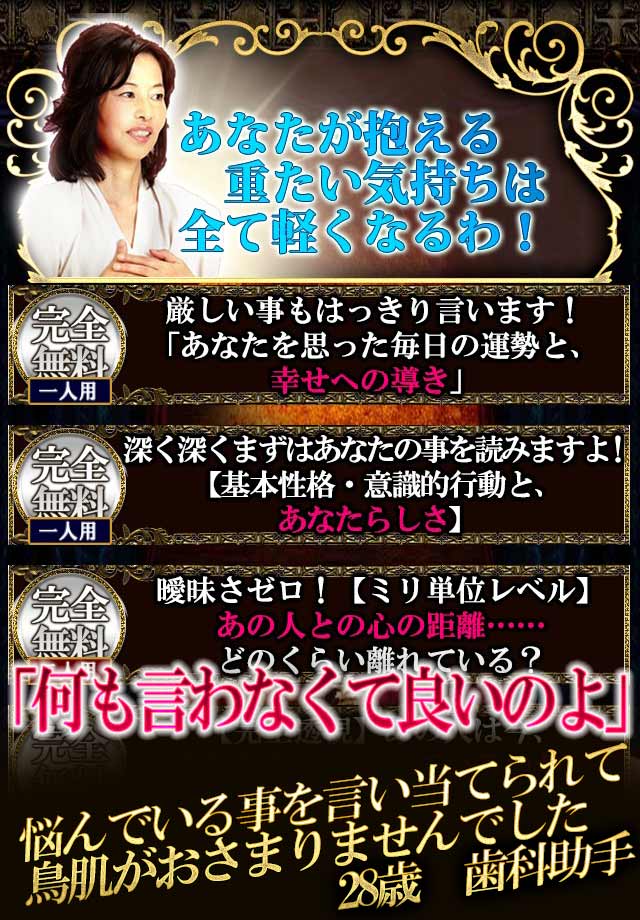 自分を知り、相手を知り、大切な人の事を知って、あなたらしい生き方を私と一緒に、見つけていきませんか。あなたには、幸せに満ち溢れた未来が待っていますよ。その幸せを確実に手にするために、私ができる事をこのアプリに詰め込みました。あなたが抱えている不安も、悲しみも、悩みも、全て解き放ってみせるわ。