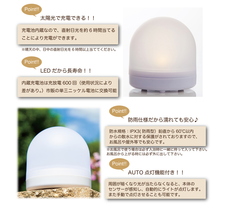 ソーラーパネルに屋外で直射日光を約6時間当てることで発電、内蔵充電池に充電します。