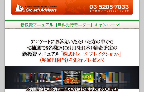 投資顧問会社グロースアドバイザーズが発行する投資教材は、経験の浅い個人投資家の方々が相場で利益を出していただけるよう、プロフェッショナルな投資術をマニュアル化したものです。
