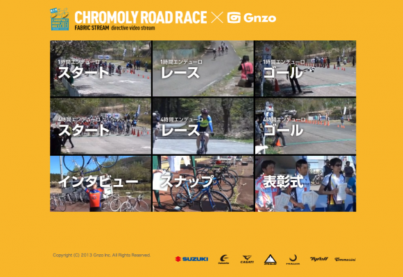 株式会社Gnzo※1(本社:神奈川県足柄上郡、代表取締役社長:小川 武重)は、2013年5月12日(日)に開催されたクロモリロードレース実行委員会主催の自転車レース「クロモリロードレース2013」にて、Gnzoの動画配信サービス「fabric video※2ソリューション」(以下、「fvソリューション」)を応用した「多地点カメラによるライブストリーミング配信」の実証実験を株式会社ジエブ協力のもと行いました。