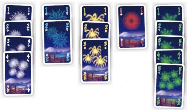 「花火」はプレイヤー協力型ゲームです。プレイヤーは、ある花火大会で火薬と導火線と発射薬を誤って混ぜてしまったうっかり者の花火師になります。花火大会はすでに開始され、パニック寸前です。花火師たちは互いに協力して、大惨事を防ぐことになります。花火師たちの目的は、同じ色の花火カードを数字の昇順(1⇒2⇒3⇒4⇒5)に並べて、見事な花火を打ち上げることです。