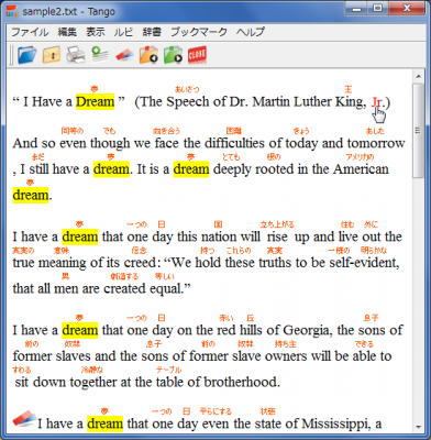 「Tango」は、英語の文章に”英単語ごとに訳語のルビを振る”ことで、英文の早読みを支援するツールです。英語学習中の学生はもちろん、英文必須の社会人ほか英文を自力で読みたいすべての方の英単語力を補助し、単語力の向上を支援するWindowsソフトウェアです。