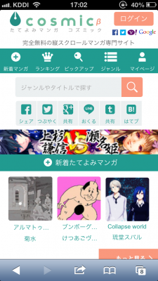 2013年6月4日、株式会社 BitGather(本社:東京都港区、代表取締役:伊藤新之介、以下 BitGather)は、クラウドソーシングと融合した縦スクロール漫画投稿サービスcosmic(コズミック 以下cosmic)のデザインを一新し、会員登録とマイページを設け、マイリスト、履歴、しおり、コメント機能を追加し、クローズド版を解除した。これにより誰でも無料で漫画をスマートフォンで読めるようになった。