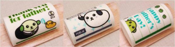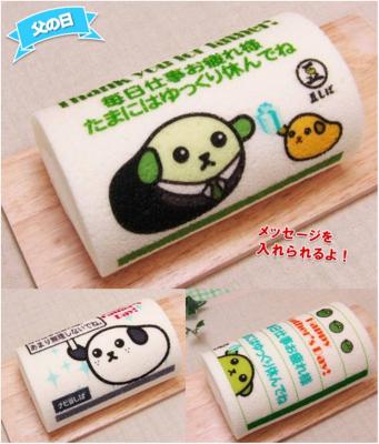 父の日限定の豆しばデザインにお好きなメッセージ(20文字以内)を、ロールケーキに直接プリント致します。こちらも3種類のデザインをご用意しております。