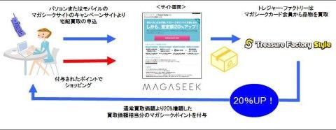 マガシーク会員がファッションECサイト「MAGASEEK 」のキャンペーンサイトよりトレジャー・ファクトリーが提供する宅配買取サービスの申込をし、買取が成立した場合、通常買取価額(※)より20%増額した買取価額相当分のマガシークポイントを付与します。マガシーク会員は付与されたポイントをマガシークが運営するファッションECサイトでのショッピングに利用することができます。