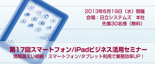 日立システムズは、「第17回スマートフォン/iPadビジネス活用セミナー」を6月19日(水)に東京・大崎で開催します。