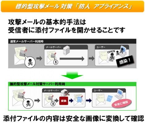 「防人 アプライアンス」は、メールに添付されたファイルを、ウィルスを含まない画像(jpg形式)に変換し表示するため、受信者はファイルの内容を安全に確認できます。これによりウィルスを含んだファイルの開封を未然に防ぎ、標的型攻撃によるウィルス感染を防止します。