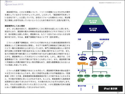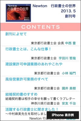 株式会社ニュートン(東京都渋谷区代々木2-1-1新宿マインズタワー20F 代表取締役高森圭介)は、東京都行政書士会・神奈川県行政書士会の会員により企画委員会を構成し、2013年6月17日、iPad/iPhone の Newsstandアプリ、 月刊Newton「行政書士の世界」を、無料にて、創刊しました。この電子書籍は、幅広い行政書士業務の広報・普及活動による行政書士業務の拡大を目的として、無料で、発刊しています。