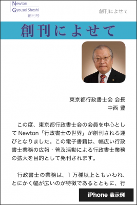 巻頭言「創刊によせて」は、東京都行政書士会会長の中西豊先生です。「この度、東京都行政書士会の会員を中心としてNewton「行政書士の世界」が創刊される運びとなりました。この電子書籍は、幅広い行政書士業務の広報・普及活動による行政書士業務の拡大を目的として発刊されます。・・・」