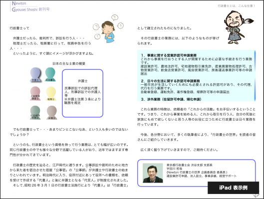 株式会社ニュートン(東京都渋谷区代々木2-1-1新宿マインズタワー20F 代表取締役高森圭介)は、東京都行政書士会・神奈川県行政書士会の会員により企画委員会を構成し、2013年6月17日、iPad/iPhone の Newsstandアプリ、 月刊Newton「行政書士の世界」を、無料にて、創刊しました。この電子書籍は、幅広い行政書士業務の広報・普及活動による行政書士業務の拡大を目的として、無料で、発刊しています。
