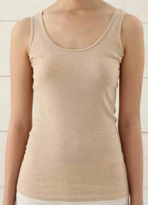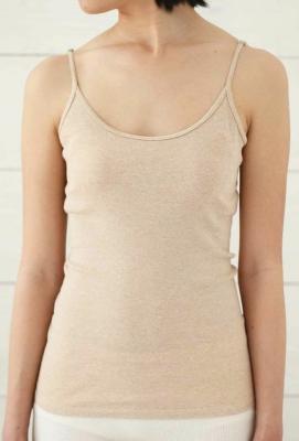 ふっくらとした肌ざわりで安定感ある着心地のノースリーブは、薄手のシャツなどの下に着ても透けにくいので、初夏以降の装いに重宝します。リニューアルしたキャミソールは深めのネックでVネックやカットソーに合わせやすく、お客様のご要望に応じて肩ひもを調節するアジャスター(ノンホルマリン製のプラスチック素材)をつけたので体型を選ばずに着ていただけます。