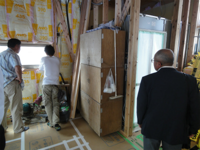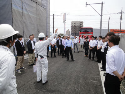 2日目は、現場きれいの徹底状況の視察をおこないました。万代ホーム株式会社様は、現場きれいとして2回清掃から始め、その後5回清掃の実施を徹底し、今ではきれいにするというよりも“汚さない現場”を心掛けて取り組んでおられます。ここまで来られるにあたり、社員や職人さんに現場きれいの意味を徹底的に教育し、現在の形が整ってきました。参加された方々は、これまでどのようにおこなっていったのか、また多くの現場をどのように管理していくのかについて、工事担当や職人に直接質問しながら勉強しておりました。