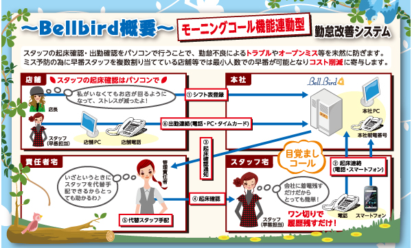 以上の様なトラブルを予防・改善するため、ABIは各業界向けスタッフの寝坊予防システム“ベルバード”を開発し、