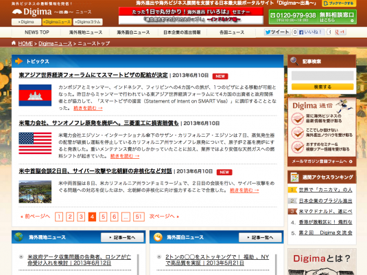 海外ビジネスにおいては、その国のローカルビジネス最新情報を握っておくことが非常に重要になってきます。しかし、そうした情報は現地でないと効率良く収集することができませんでした。そこで、海外進出サポートに特化したポータルサイト『Digima~出島~』(URL:http://www.digima-japan.com/)では、海外ビジネスのメディア機能を強化、『Digima~出島~ ニュース』という現地ビジネスニュースを配信するサイトを6月5日にオープンいたしました。現地ビジネスニュースに加え、日系企業の海外進出情報、海外面白ニュースなど、 海外進出をする上で毎日チェックしておきたい情報が満載です!