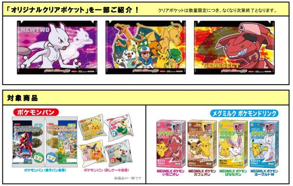 キャンペーン期間中、ポケモンパンもしくはメグミルクポケモンドリンクについている「ひきかえけん」 2枚をナムコのキャンペーン実施店舗にお持ちいただくと、「オリジナルクリアポケット」(全6種)を1つプレゼントします。