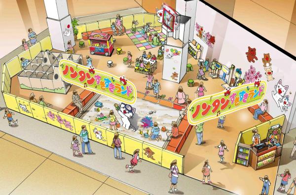 「ノンタンすきすきランド」は、ノンタンの絵本の世界で、親子一緒に遊びながらお子様の成長が確認できる時間課金制のキャラクター体験施設です。施設には、絵本『ノンタン およぐのだいすき』をモチーフにした砂場、絵本『ノンタン ボールまてまてまて』をモチーフにした迷路、ノンタンの絵本やアニメに触れ合える「えほんコーナー」や「できるもんステージ」、お子様の成長を測定できる「せいちょうそくてい」等でお楽しみいただけます。また店頭ではノンタンのアニメDVD販売もいたします。