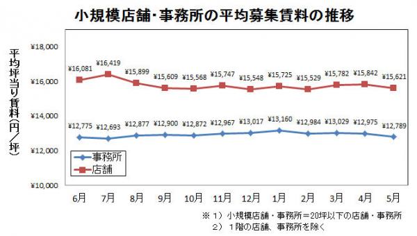 また、小規模店舗の平均募集賃料は、5月に前月比1.4%下降しましたが、2012年の秋以降、1.5万円台半ば程度で安定的に推移しています。