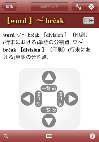LogoVista電子辞典で培った検索方法を継承。前方一致/後方一致/完全一致/成句検索/全文検索といった豊富な検索オプションを利用できます。文字を入力すると候補見出し語が表示されるインクリメンタルサーチ、検索結果に表示された単語をタップすることでそのまま連続辞書引きも可能。また、iPhone/iPod touchのマルチタッチアクション、センサーによる画面の回転にも対応しています。