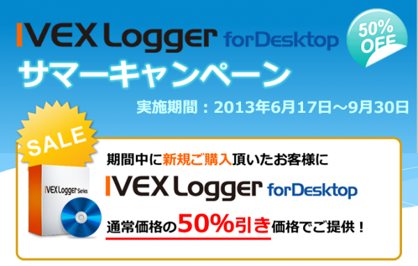 本日よりIVEXでは、IVEX Logger for Desktopのサマーキャンペーンを実施します。期間中にIVEX Logger for Desktopを新規で導入する企業を対象に、IVEX Logger for Desktopのライセンス(保守料金含)を参考定価より50%割引価格で提供します。 (2013年9月末日迄)