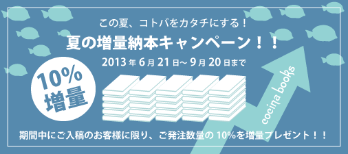 インターネットを通じて自費出版サービスを提供するコシーナブックス(運営:株式会社アドリブハウス 石川県金沢市 代表取締役:田中泰 http://www.cocinabooks.jp/)は、2013年6月21日(金)から9月20日(金)までの期間、【夏の増量納本キャンペーン】を開始いたしました。