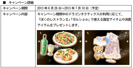 また、dゲームからの配信開始を記念して2013年6月26日(水)よりエニッシュがdゲームで提供中のアプリ「ぼくのレストランII」「ガルショ☆」との横断キャンペーンを実施します。ぜひ、下記よりアクセスしてお楽しみください。