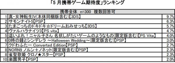 ユーザーがオススメする5月発売の携帯ゲームトップ3は、1位「真・女神転生IV」、2位「サモンナイト5」、3位「たまごっちのドキドキ☆ドリームおみせっち」となりました。