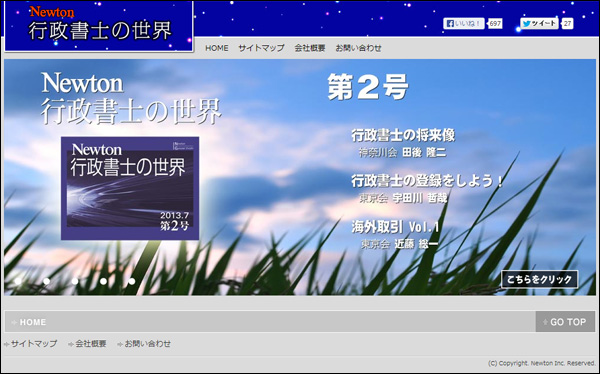 株式会社ニュートン(東京都渋谷区代々木2-1-1新宿マインズタワー20F 代表取締役高森圭介)は、2013年6月20日、月刊Newton「行政書士の世界」(WEB版)第2号を公開しました。幅広い行政書士業務の広報・普及活動による行政書士業務の拡大を目的としています。(URL)http://gyousei-world.newton-jp.com/(お問い合わせ先)03-5352-7760