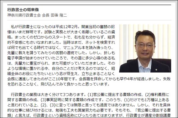 巻頭言「行政書士の将来像」は、神奈川県行政書士会会長の田後隆二先生です。「・・・行政書士業務には、まだまだ開拓されていない、研究されていない、知られていない分野が山ほどあり、宝は埋もれているのです。これから行政書士を目指す人には、ぜひともその宝を掘り起こしていただき、その道のパイオニアとして名を馳せていただきたいと期待しています。・・・」