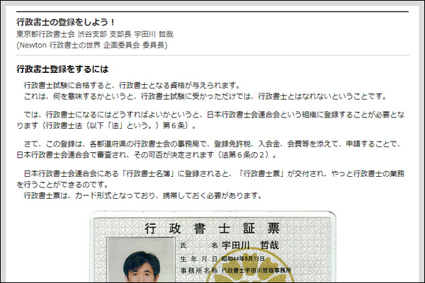「行政書士の登録をしよう!」は、東京都行政書士会渋谷支部長 (Newton行政書士の世界・企画委員長)宇田川哲哉先生が執筆。「・・・日本行政書士会連合会にある「行政書士名簿」に登録されると、「行政書士票」が交付され、やっと行政書士の業務を行うことができるのです。行政書士票は、カード形式となっており、携帯しておく必要があります。・・・」